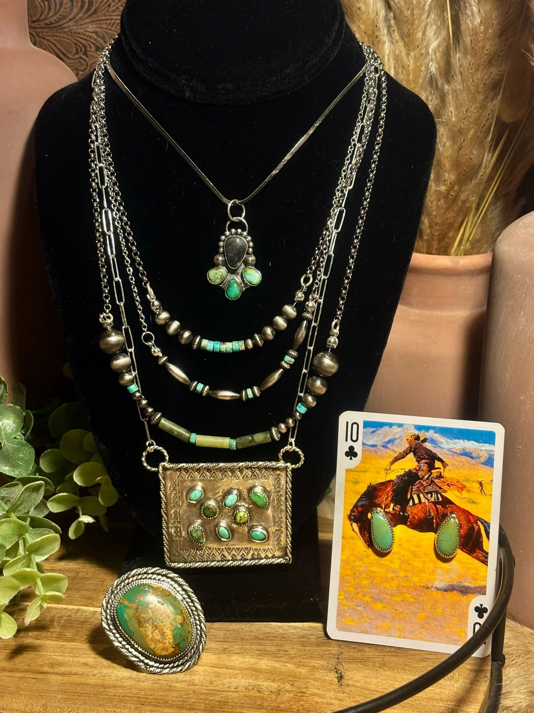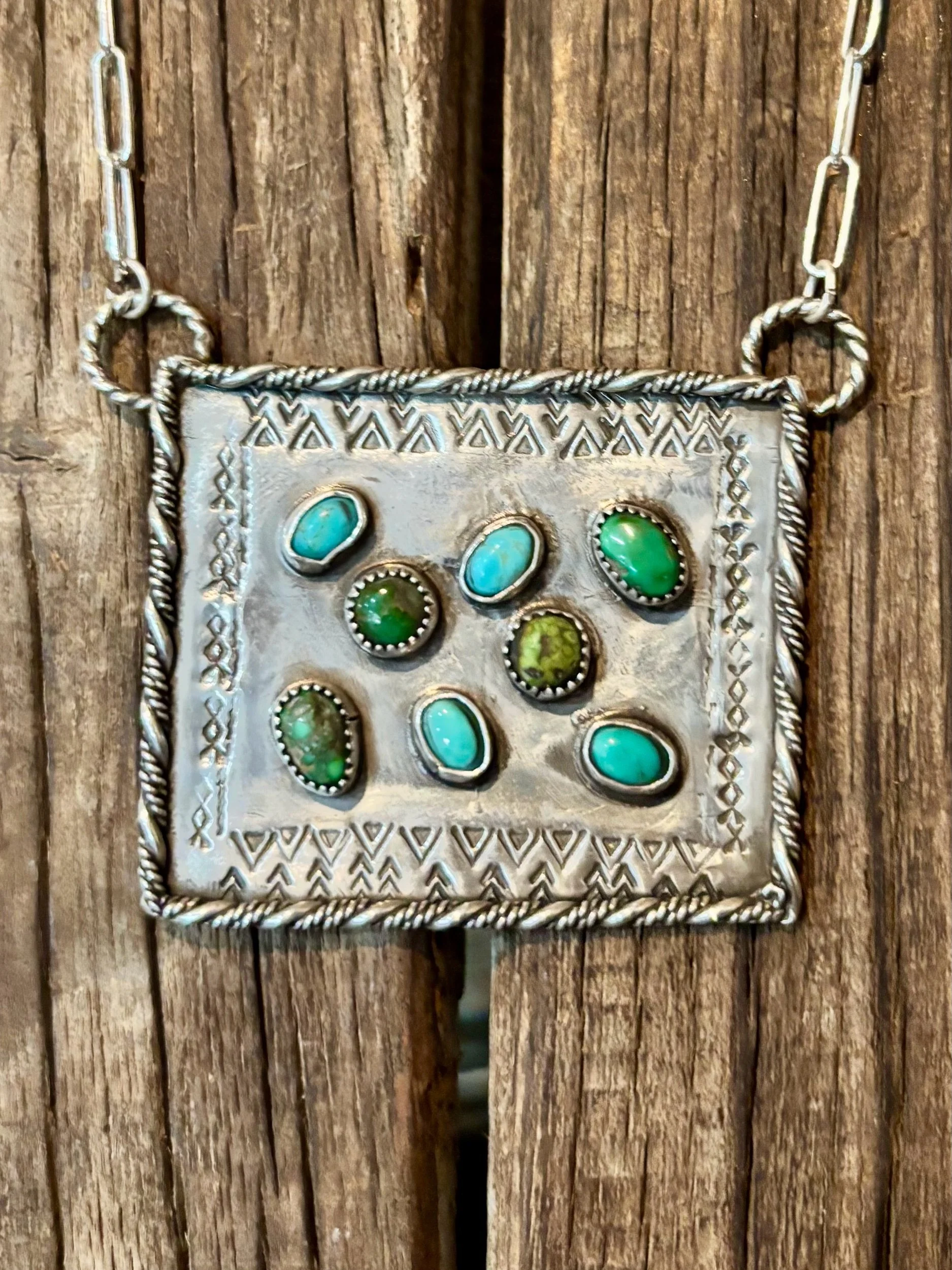 Royston & Sonoran Turquoise cluster bar necklace set in sterling silver on hand stamped sterling silver backplate, sitting on 18” sterling silver chain.